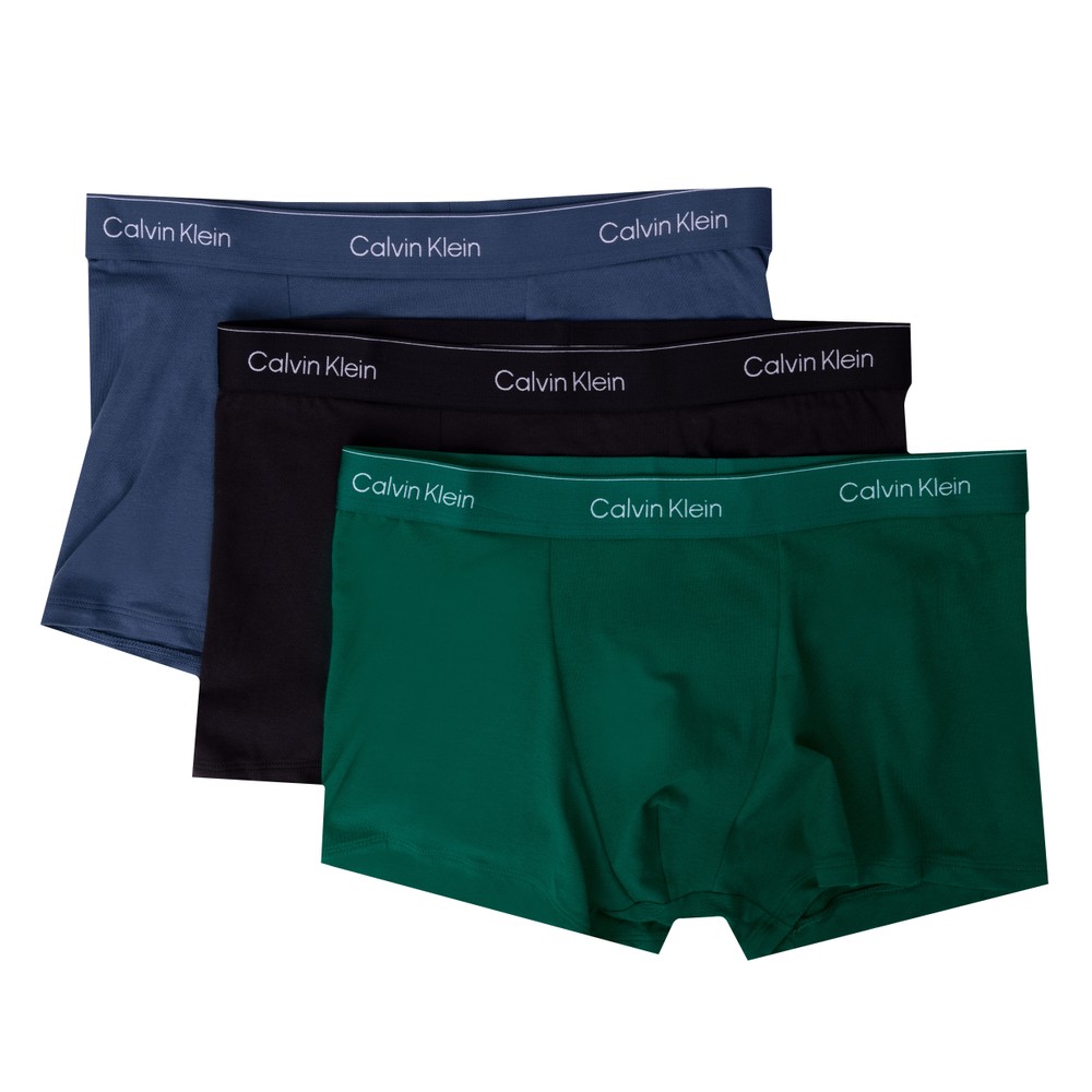 Calvin Klein Jeans Relaxed Fit Trunks in Turf Green, Black and Blue brings a classic look from Calvin Klein Jeans to the latest underwear collection from the brand for the new season, great as a top-up piece. Sold in a pack of three pairs that are cut in a relaxed fit with a branded waistband to each.