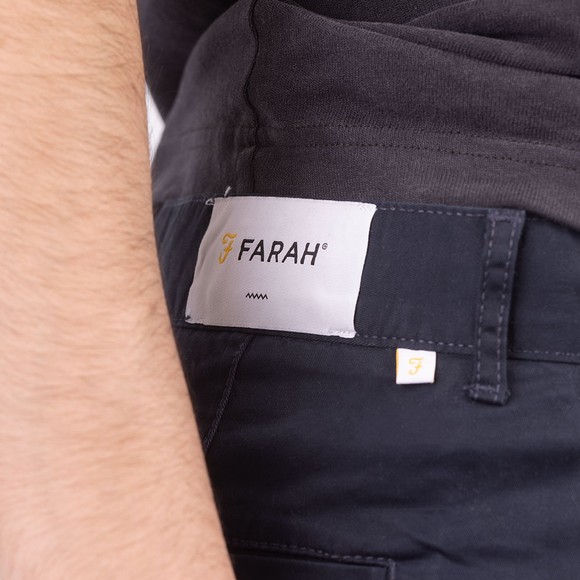 Farah Hawk Chino Short in True Navy. A classic style chino short that features a four pocket design, zip fastening fly that has a single button closure and the iconic Farah logo embroidered to thigh.