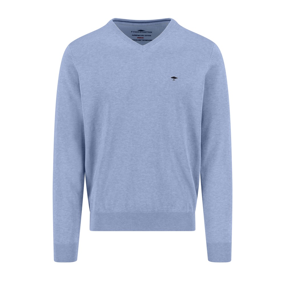 Fynch Hatton Superfine Cotton V Neck Jumper in New Breeze makes the perfect staple piece for your smart-casualwear wardrobe with its comfortable and simple design, great for cooler weather. Cut to a V neck and featuring embroidered branding to the left side of the chest.