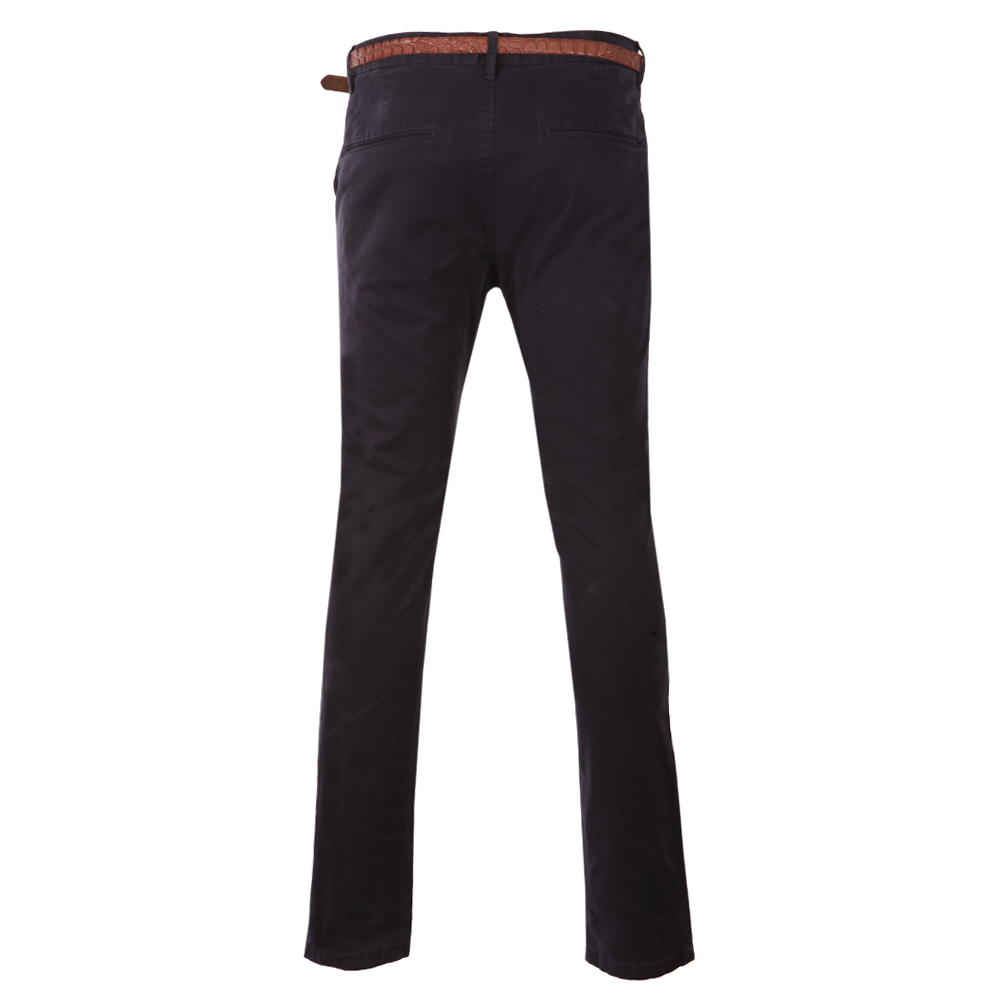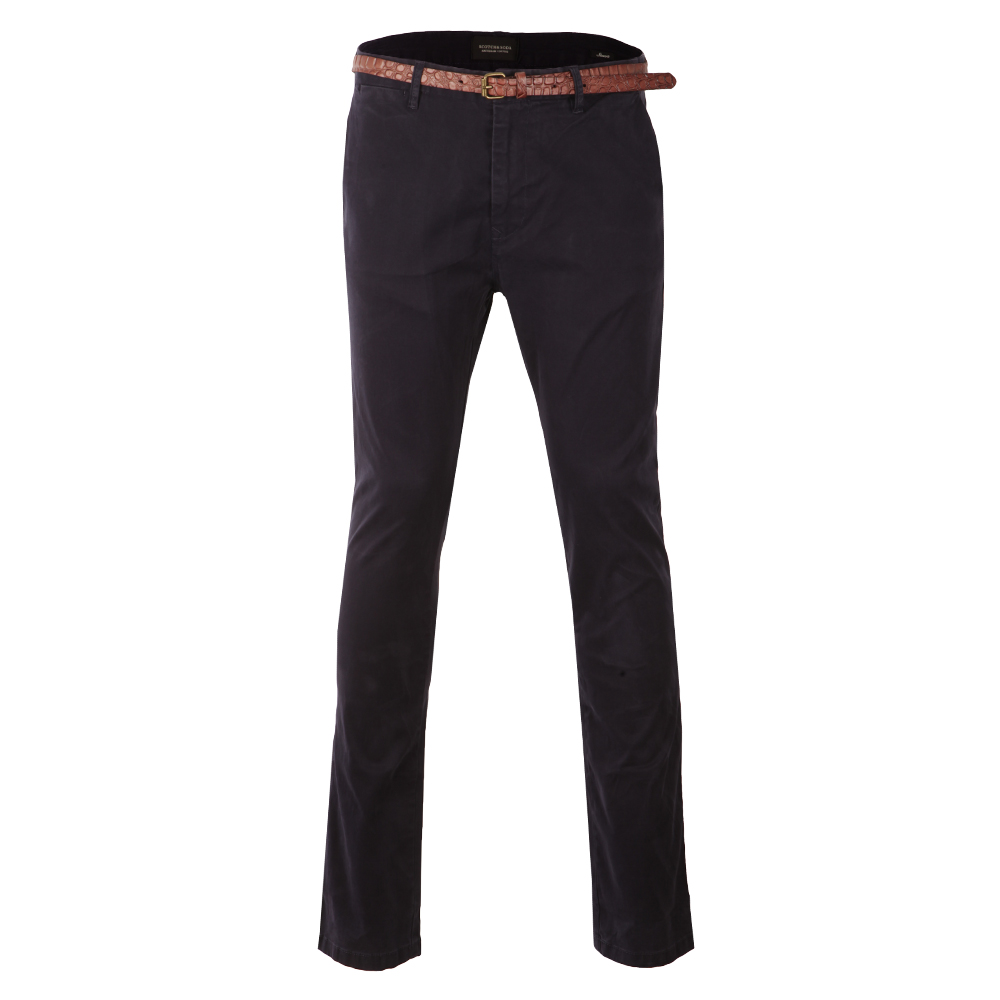Scotch & Soda Chino In Stretch Cotton in Navy. A classic chino style in a slim fit which features a zip fastening fly that has a single button closure, two side and two back pockets.Belt included and completed with the Scotch & Soda branded tab to the side of the side pocket.