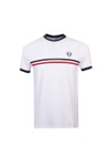 Sergio Tacchini Supermac S/S T-Shirt in White, Navy and Red. This short-sleeved T-Shirt features a contrast coloured crew neck that matches the cuffs of the T-Shirt, and a double stripe design is then added across the chest. The Supermac is finished with an embroidered Sergio Tacchini logo on the left of the chest.