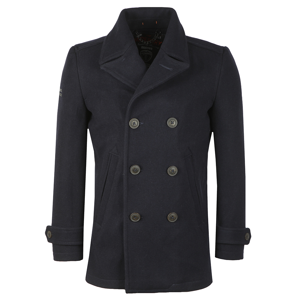 Superdry New Merchant Pea Coat in Navy. A plain, button closure pea coat with a heavy finish and metal, branded badges on the right sleeve.